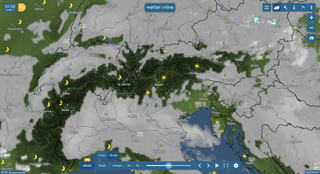 Veel hochnebel ten noorden en zuiden van de Alpen. @Wetteronline