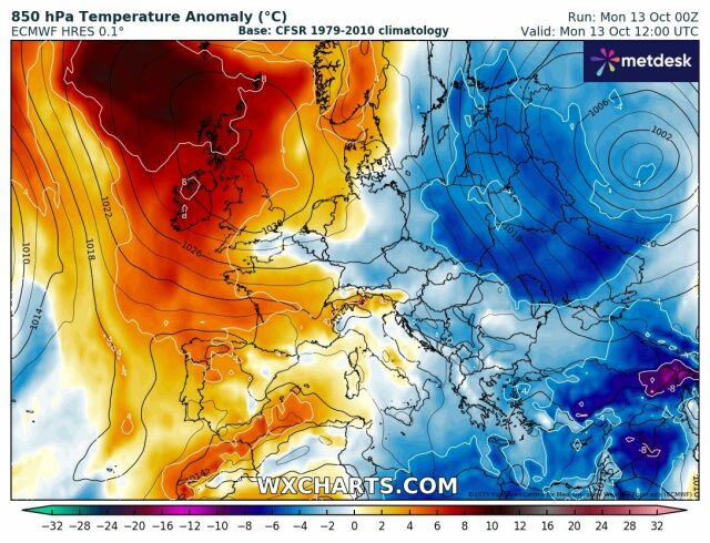 Oost-Europa stroomt vol met koude lucht. Noordwest Europa zit vol met zeer zachte lucht. De Alpen liggen tussen de twee in.